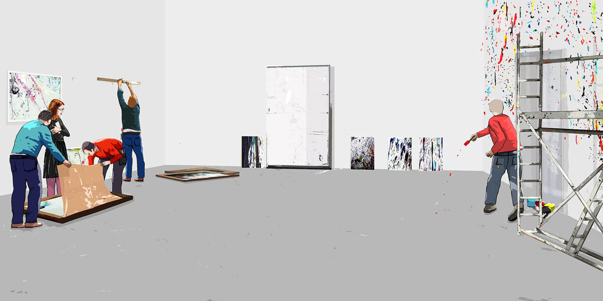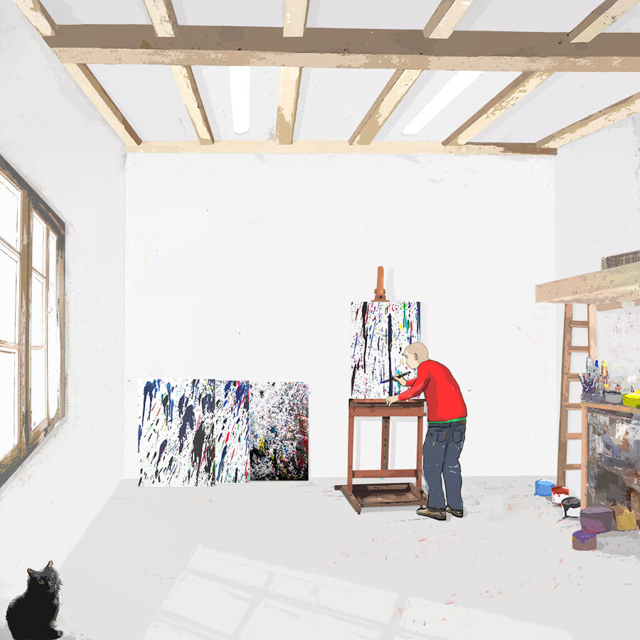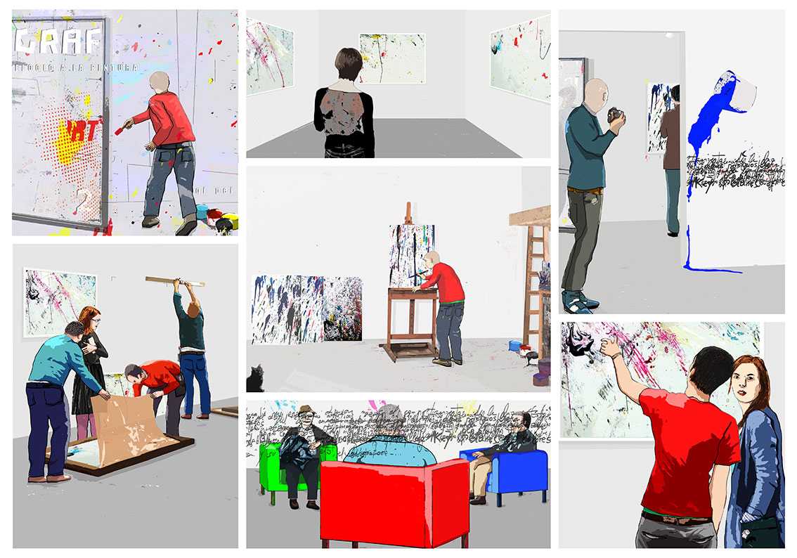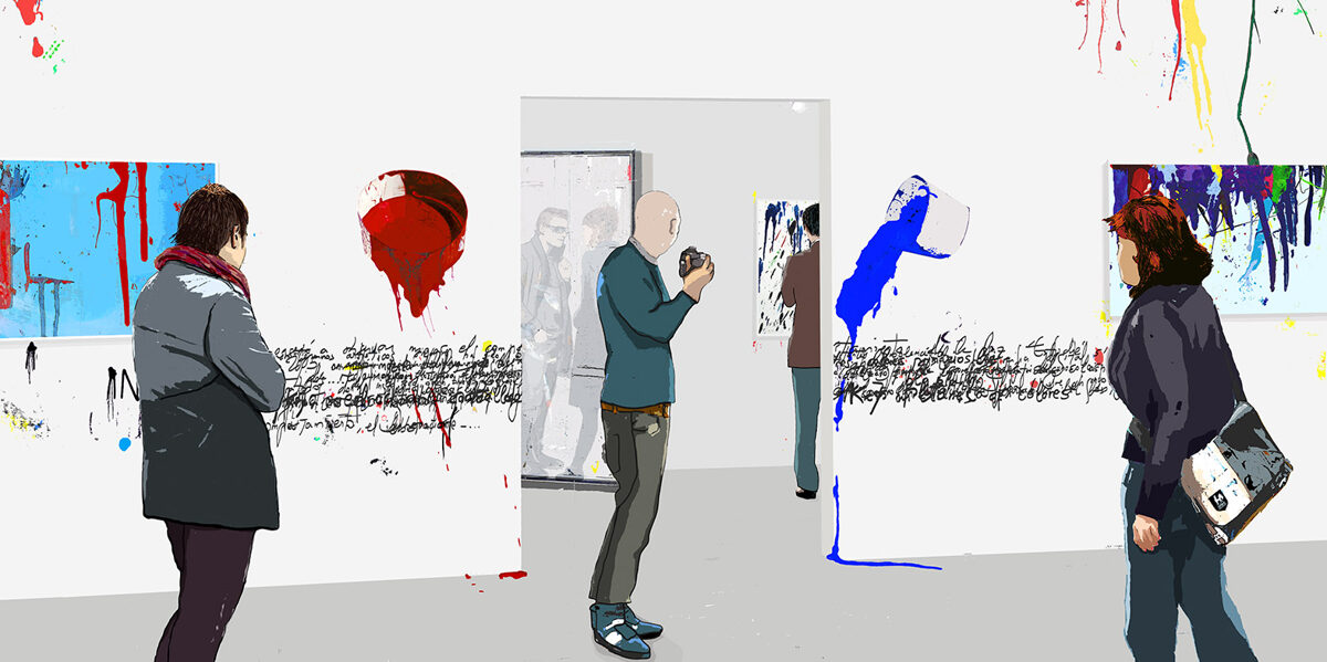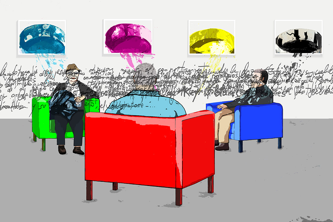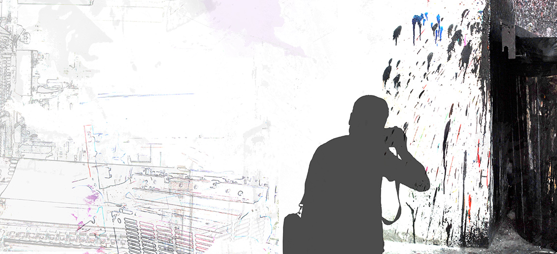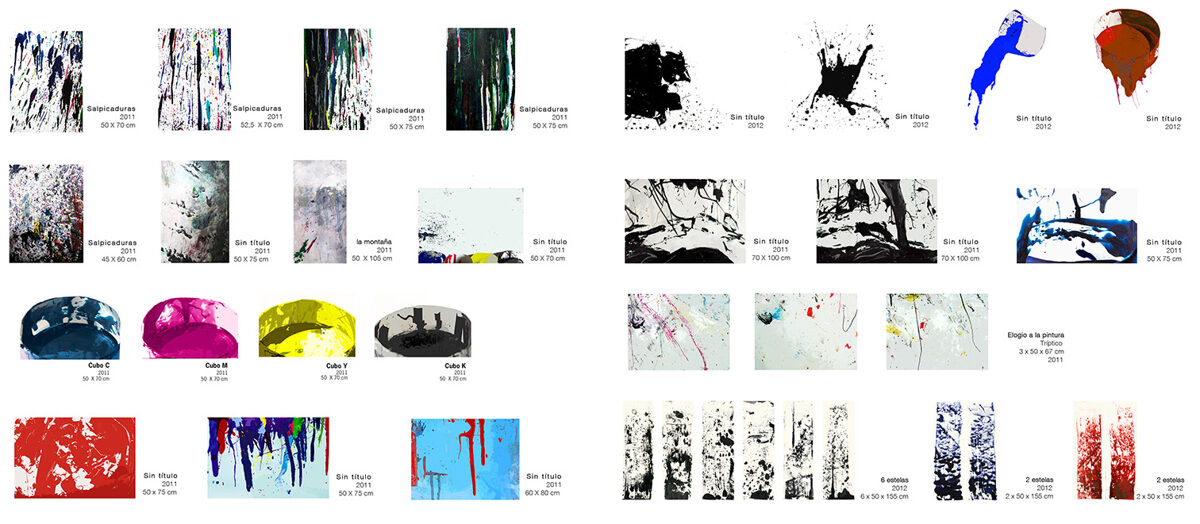11 de mayo del 2011. Imprenta COPINOVA. Burgos.Mientras estoy hablando con Yoli y Chuso, me he fijado en unas manchas, en unas salpicaduras de pintura de la pared del fondo. Retiro el cubo de la basura, que cubre parte de las machas, y tomo una serie de fotos del lugar.
